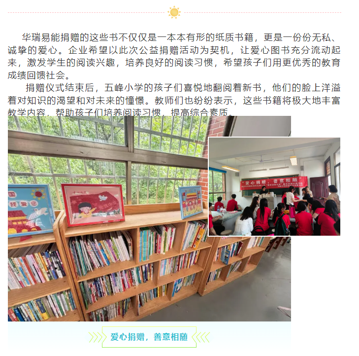 5月6日上午,在曉米加教育工作室梁曉博士的組織下,湖南華瑞易能電氣有限公司副總經(jīng)理胡銀霞及工會主席張燦輝來到長沙市岳麓區(qū)蓮花五峰小學(xué),代表華瑞易能向?qū)W校捐贈書籍。
